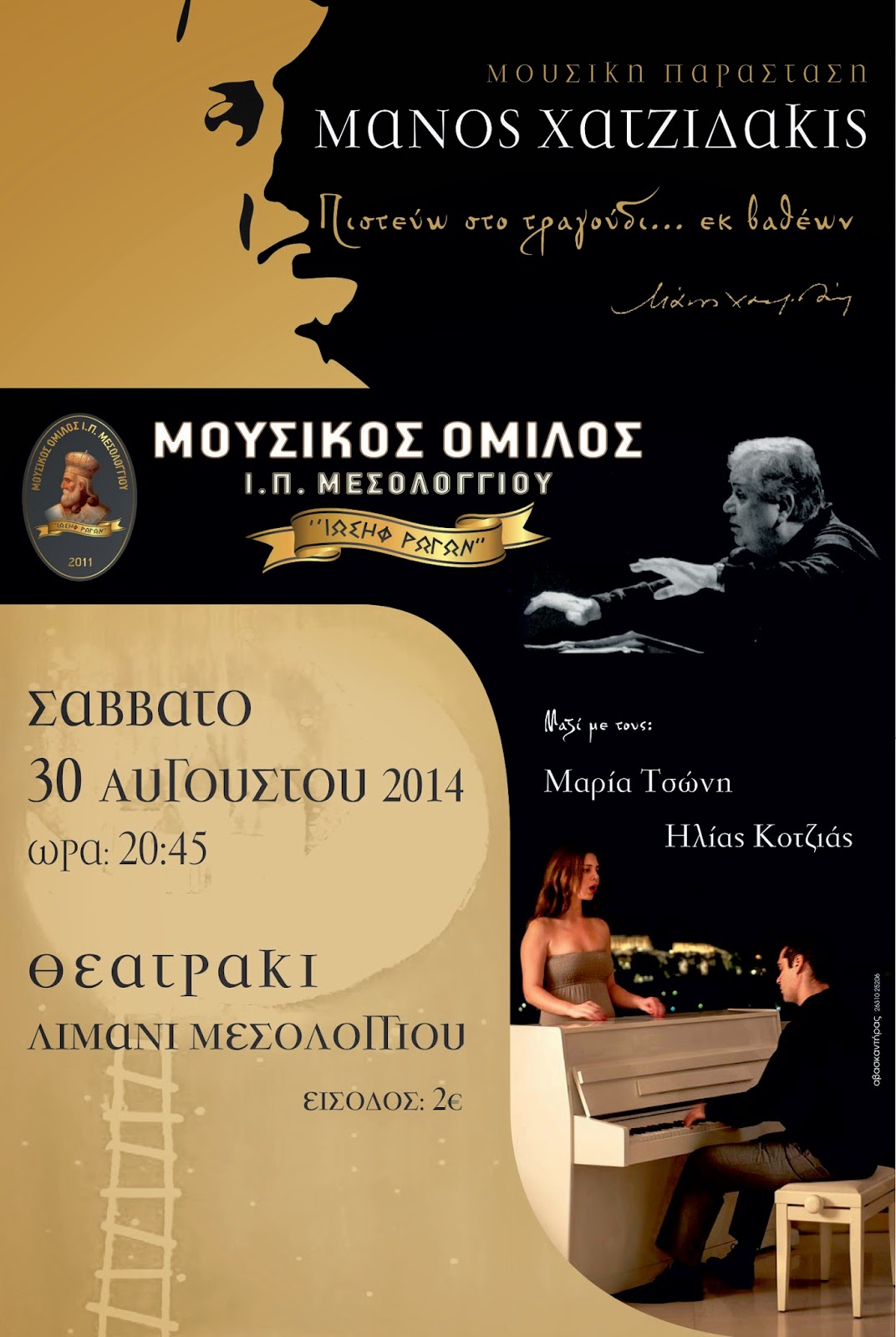 Η Φιλαρμονική ορχήστρα του συλλόγου σε συνεργασία με την τραγουδίστρια Μαρία Τσώνη και τον Πιανίστα-Συνθέτη Ηλία Κοτζιά θα σας ταξιδέψουν στις όμορφες μελωδίες του Μάνου...